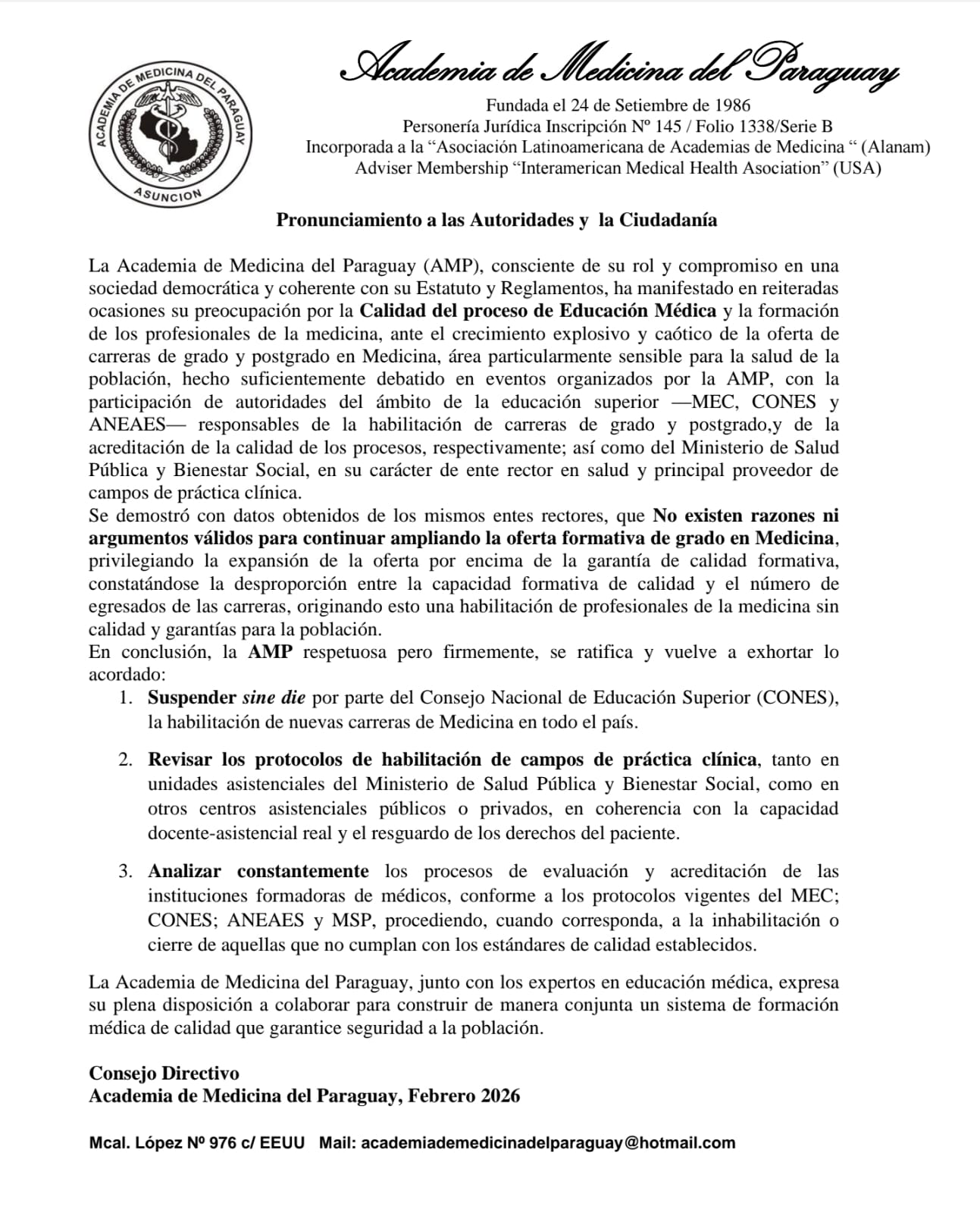 Pronunciamiento sobre Educación Medica Grado/Postgrado Publicado en Eventos Vea el Documento completo desde aqui Imprimir Correo electrónico