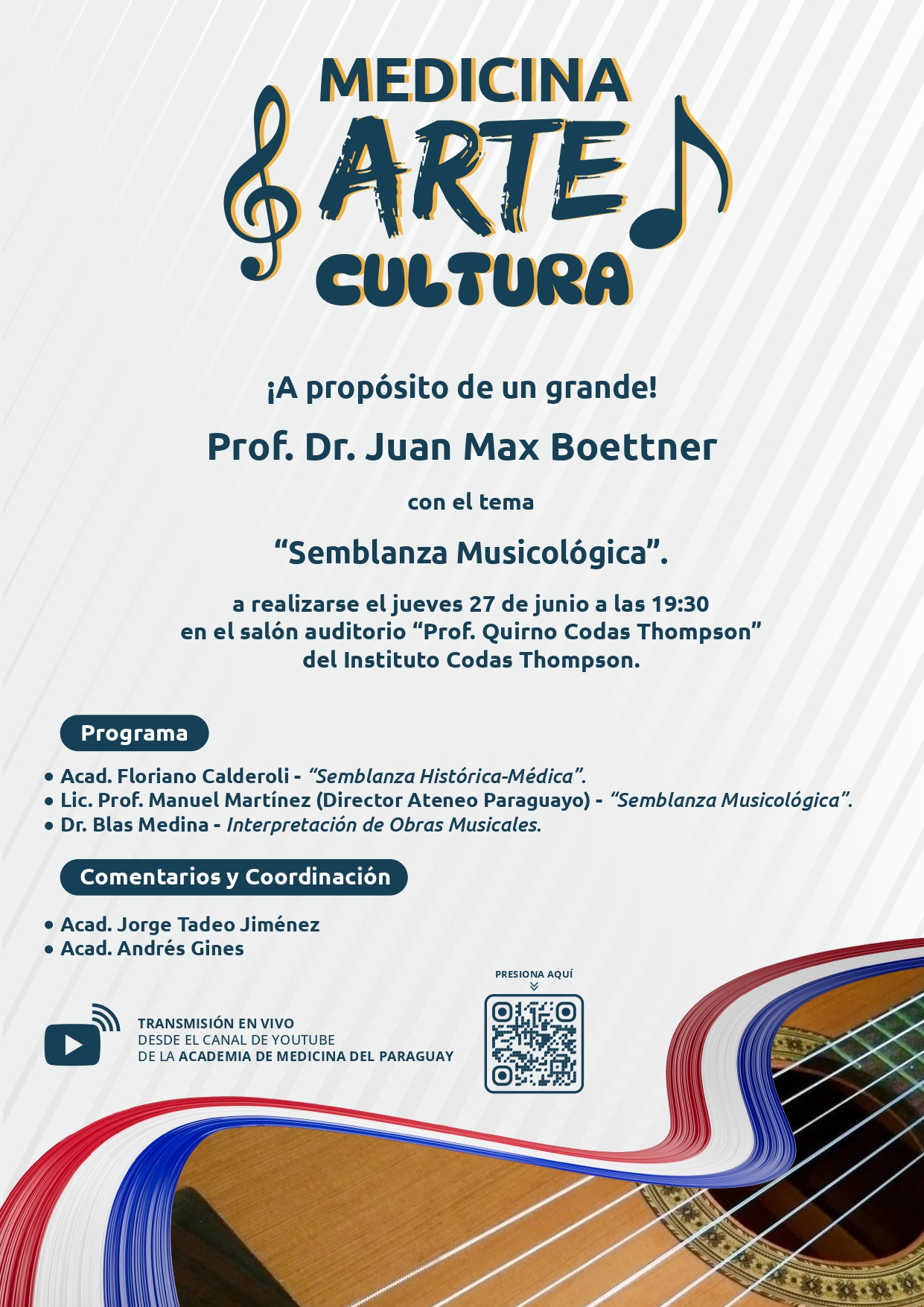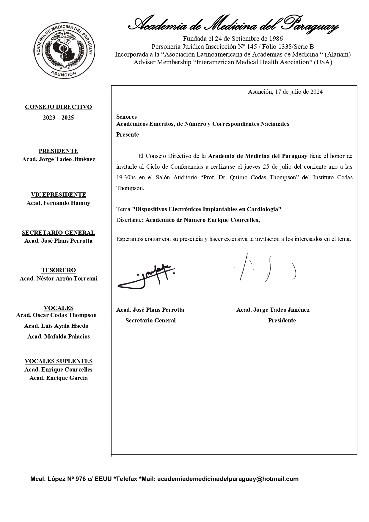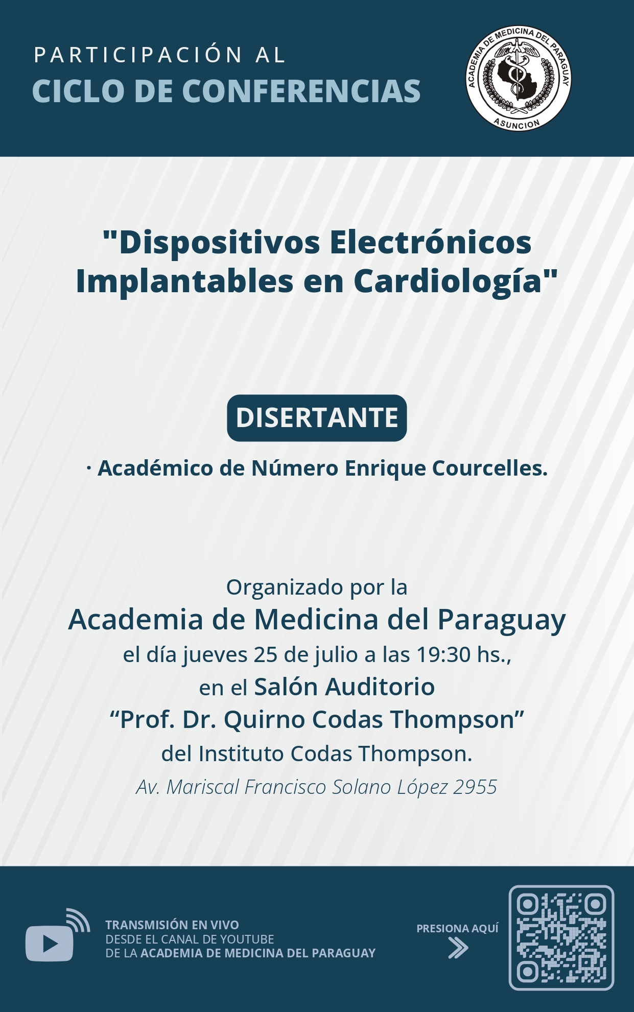 El Consejo Directivo de la Academia de Medicina del Paraguay, invita al ciclo de conferencias a realizarse el jueves 25 de julio del presente año a las 19:30 hs en el Salón Auditorio "Prof. Dr. Quirno Codas Thompson" del Instituto Codas Thompson.